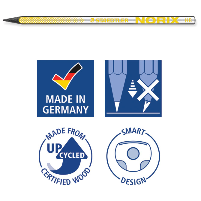 šiljene; bez gumice; novi,jedinstveni oblik olovke povećava udobnost pisanja,crtanja i skiciranja; meka neklizajuća površina olovke; crno drvo; meka mina otporna na lom; izrađena od prerađenog drvnog otpada (Upcycled wood); izrađene od certificiranog drva; blister