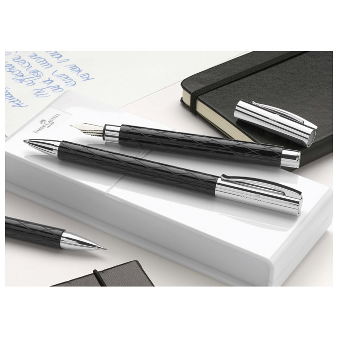 tijelo olovke izrađeno od crne dragocjene smole visokog sjaja sa utisnutim rombovima za moderan izgled; promjer kuglice: 1,2 mm (B); širina ispisa 0,6 mm; uvrnuti čep sa klipsom i vrh izrađeni od kromiranog poliranog metala; okretni (twist) mehanizam; boja tinte: crna; u poklon kutiji