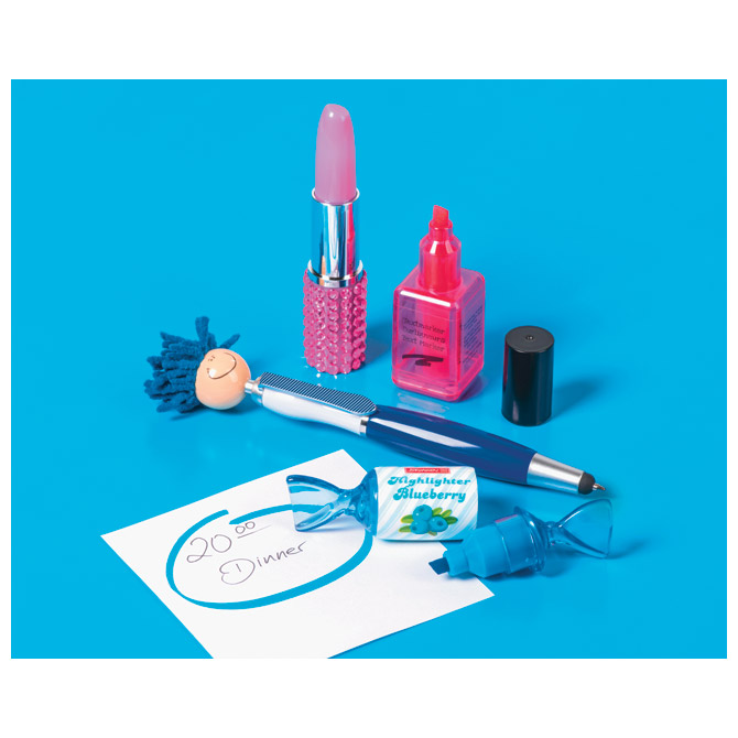oblik: ruž; duljina: 10 cm; s poklopcem; boja tinte: plava; 3 boje: ljubičasta, svijetloroza i tamnoroza