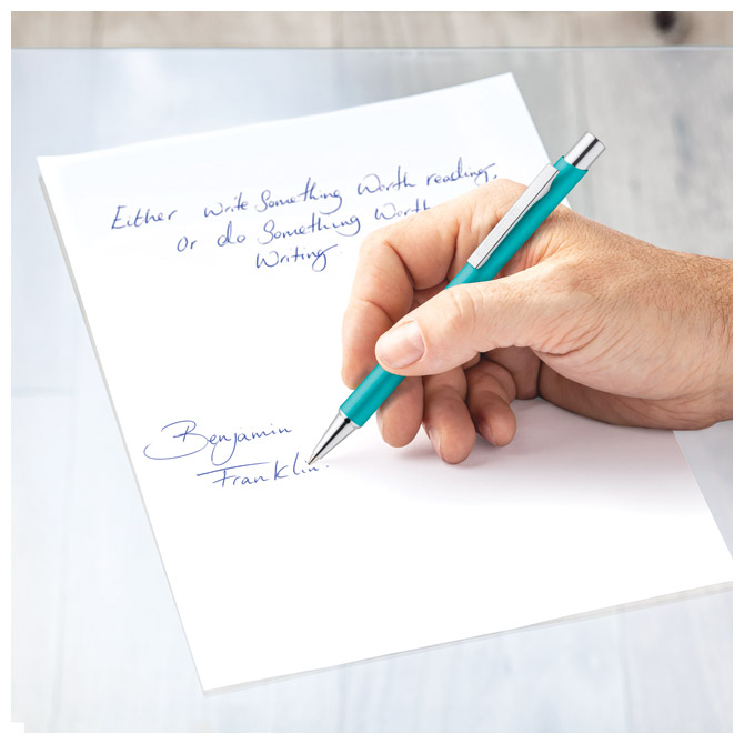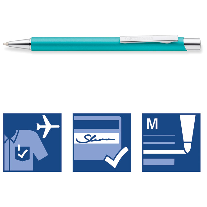 širina ispisa: M; metalna; pritisni mehanizam; neizbrisiva tinta sukladno normi ISO 12757-2; siguran rad u zrakoplovu zahvaljujući sustavu za izjednačavanje tlakova koji sprječava istjecanje tinte (airplane safe); visokokvalitetni metalni uložak velikog kapaciteta (G2); boja tinte: plava