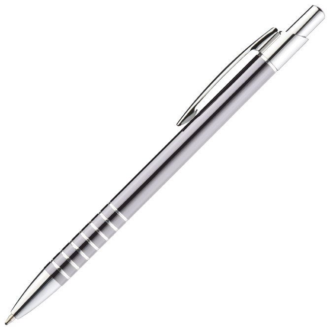 tanko tijelo olovke (slim); metalno tijelo olovke te vrh i klipsa; gravirani grip (srebrni prsteni); plastični uložak; pritisni mehanizam; boja tinte: plava