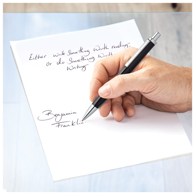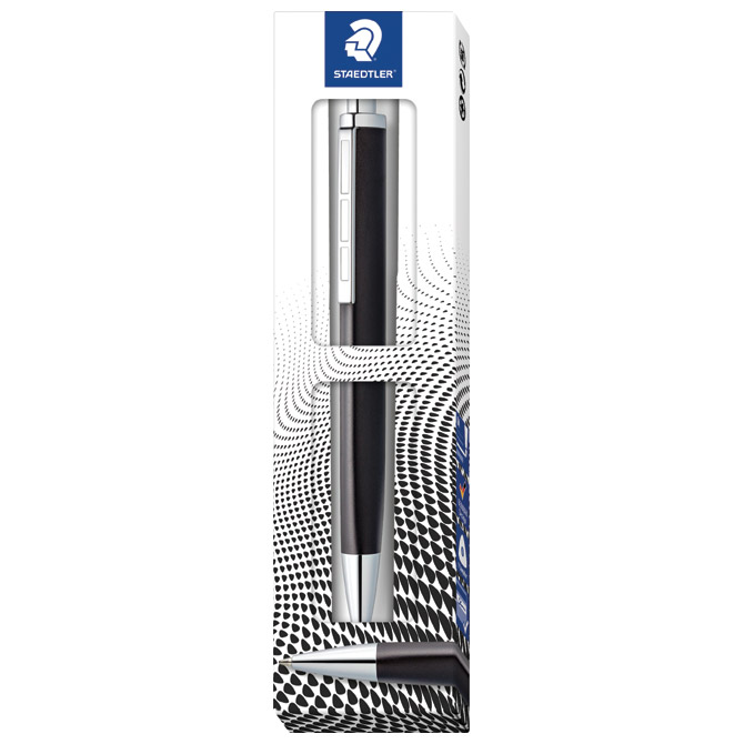 širina ispisa: M; metalna; uložak velikog kapaciteta (G2); sa ugraviranim natpisom STAEDTLER na prstenu i STAEDTLER Mars na kapici; boja tinte: plava; u kartonskoj poklon kutiji