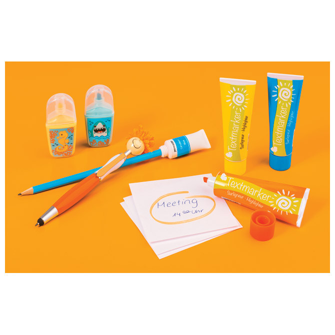 sa kapicom pogodnom za touch screen; duljina: 15 cm; plastična klipsa i tijelo olovke; pritisni mehanizam; boja tinte: plava; refil standardni velikog kapaciteta; 4 boje: narančasta, plava, roza i zelena