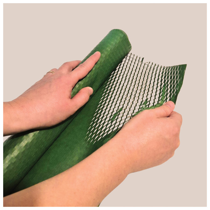 rola; dimenzije: 50cmx10m; saćaste strukture; 80 g/m2; održiv,ekološki i 100% biorazgradiv; jednostavno ekološki prihvatljivo rješenje za omatanje; malih dimenzija, može se postaviti bilogdje; lako se trga na potrebnu duljinu, eliminira otpad i potrebu za škarama; savršeno za startupove i kućne web trgovine; održiva alternativa mjehurićastoj foliji