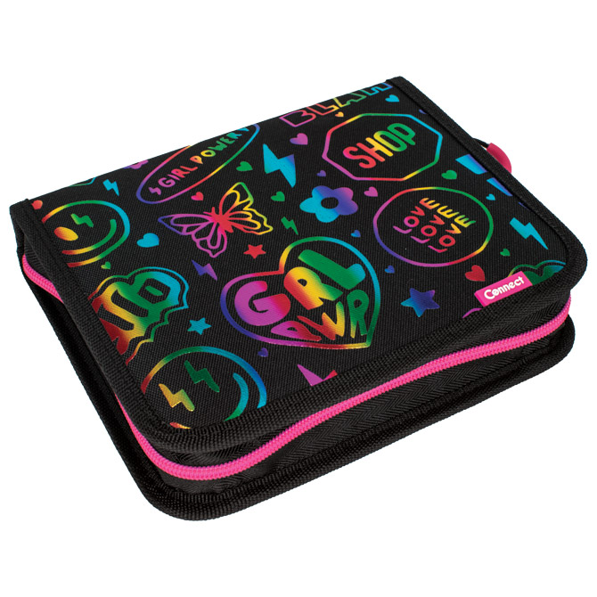 1 zip, 2 preklopa; sadrži 35 komada pribora: flomaster školski 12 boja, boje drvene 12 boja, olovka grafitna HB x 2 komada, šiljilo, gumica, ravnalo pvc, olovka kemijska trobojna, olovka tehnička 0,5 mm, mine 0,5 mm, olovka kemijska i raspored sati x 2 komada; dimenzija: 20x16x4 cm