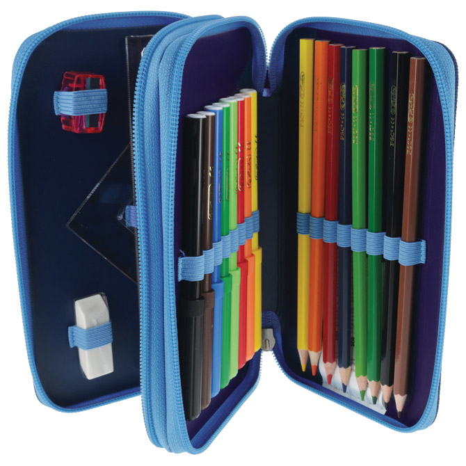 2 zipa; punjena s 23 komada pribora: flomaster školski 8 boja, boje drvene 8 boja, olovka grafitna HB x 2 komada, šiljilo, gumica, ravnalo pvc, trokut i olovka kemijska