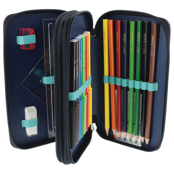 2 zipa; punjena s 23 komada pribora: flomaster školski 8 boja, boje drvene 8 boja, olovka grafitna HB x 2 komada, šiljilo, gumica, ravnalo pvc, trokut i olovka kemijska; dimenzija: 19,3×11,5×4,5 cm