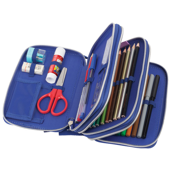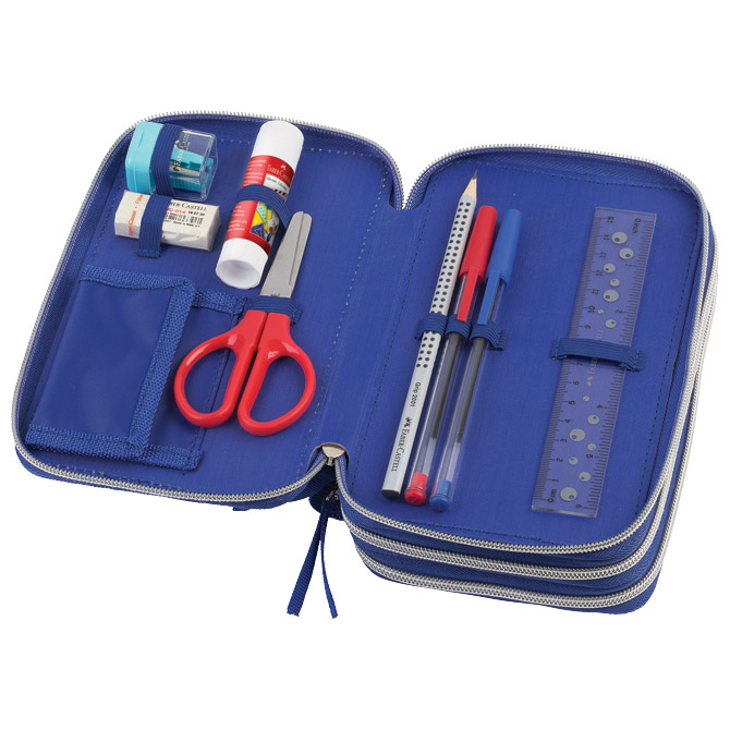 3 zipa; Faber- Castell punjenje s 44 komada pribora: flomaster školski 18 boja, boje drvene 18 boja, 1 olovka grafitna HB, šiljilo, gumica, ravnalo 15 cm, ljepilo 9g, škare, 2 olovke kemjske (plava i crvena); visokokvalitetna podstava i zatvarači