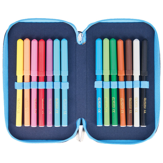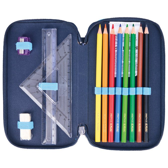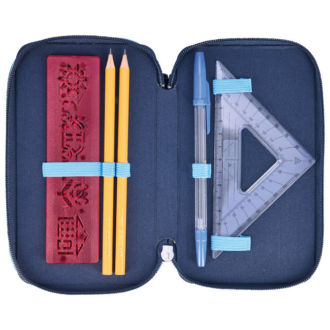 3 zipa; punjena s 31 komadom pribora: flomaster školski 14 boja, boje drvene 8 boja, olovka grafitna HB x 2 komada, šiljilo, gumica, ravnalo pvc x 2 komada, trokut x 2 komada i olovka kemijska; dimenzija: 19×11,5×7 cm