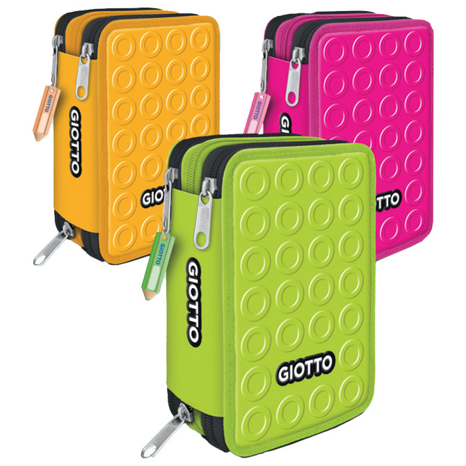 3 zipa; Giotto punjenje s 46 komada pribora: flomaster školski 18 boja, boje drvene 18 boja, 1 olovka grafitna HB, 1 olovka grafitna 2B, šiljilo, gumica, ravnalo 15 cm, ljepilo 10g, škare, 2 olovke kemjske s gumicom za brisanje tinte (plava i crvena); 1 olovka kemijska (crna tinta); dimenzija: 12,9×19,5×7,5 cm