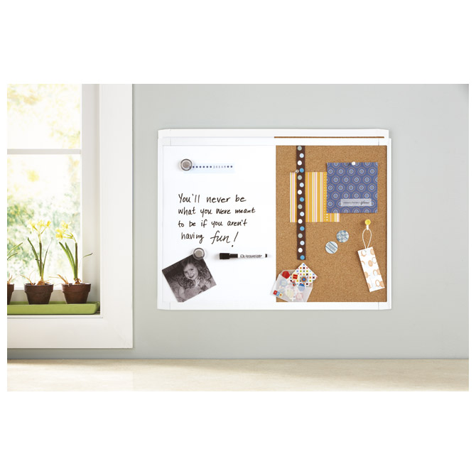 dimenzija: 58,5×43 cm; multifunkcionalna magnetna bijela ploča i pluto ploča; s elegantnim dvobojnim obrubom u raznim bojama – bijeloj, ugljenosivoj ili crnoj; može se montirati na zid s ljepljivim jastučićima; sadrži: marker za ploču, 2 magneta za ploču, ljepljive jastučiće za montažu; ugrađen držač za marker na ploči za sigurno spremanje markera kada nije u upotrebi
