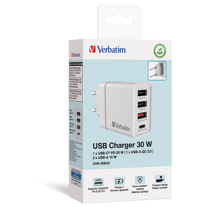 Punjač za mobilne uređaje zidni 1xUSB-C/PD 20W/1xUSB-A QC 3.0/2xUSB-A 10W Verbatim 49701 bijeli