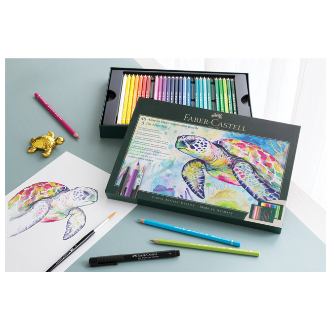 sadrži: 40xboje drvene-vodene Albrecht Dürer,3xfineliner Pitt artist black (S,F,M); 1xPitt artist brush pen black(B), 1xPitt artis flom. Black (1,5), 1xkist