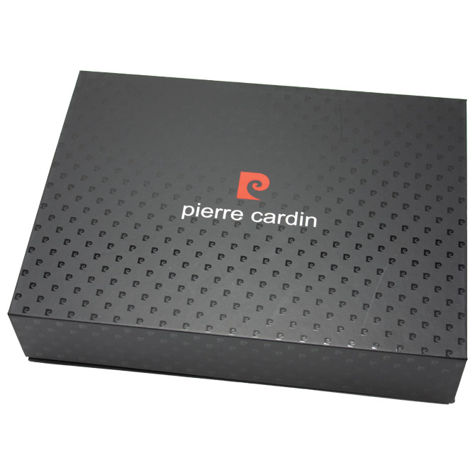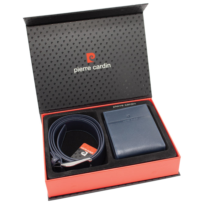 muški; kožni; u kartonskoj poklon kutiji sa zatvaranjem na magnet; sadrži: remen (širina: 3,4 cm; trn kopča; prošiveni) i novčanik (odjeljak za sitni novac; zatvaranje na preklop)