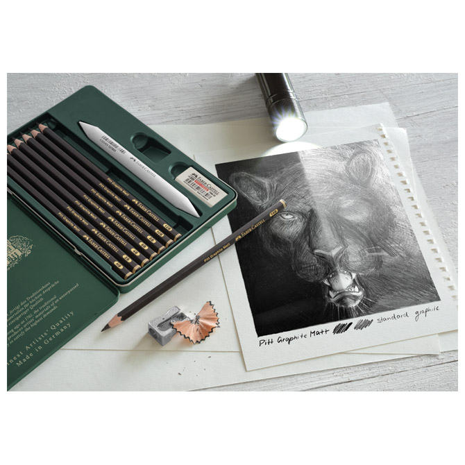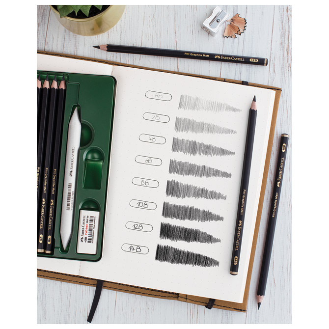 sadrži: 8 gradacija Pitt Graphite Matt grafitnih olovaka: HB, 2B, 4B, 6B, 8B, 10B, 12B i 14B (šiljena; debljina mine: 3,3 mm; bez gumice; šesterokutna; izuzetno mat grafitna olovka vrhunske umjetničke kvalitete; ultra mat grafitni ispis za smanjenje refleksije na papiru; najveća gustoća tonske vrijednosti za učinak maksimalne dubine; za pisanje, crtanje i skiciranje; posebno pogodno za jednobojne grafitne radove; posebno je otporna na lomljenje; eko olovka (drvo iz certificiranog održivog šumarstva); tijelo lakirano eko lakom na bazi vode), metalno šiljilo, gumicu (PVC-free) i olovku za sjenčanje; u zelenoj metalnoj kutiji (dimenzija: 124×185 mm)