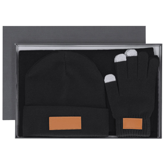 Set od 3 dijela: kapa, šal i rukavice osjetljive na dodir,jedna veličina, za odrasle. Svaki komad ima smeđu PU etiketu prošivenu, savršenu za brendiranje. Dolazi u crnoj kutiji. Dim. 34,9×4,8×22,8 cm