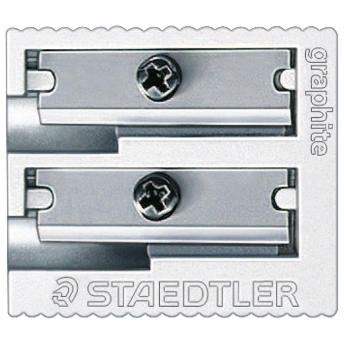 metalno; 2 rupe; za olovke standardne debljine do fi: 8,2 mm sa kutom šiljenja od 23° (grafitne) i Jumbo olovke (grafitne olovke i drvene bojice) debljine do fi: 10,2 mm sa kutom šiljenja od 30°