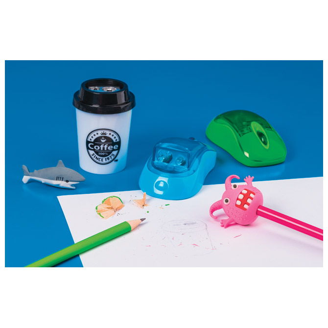 metalno; s PVC kutijom; 2 rupe; za standardne i jumbo olovke; dimenzija: 8,6×4,7 cm; 4 boje: ljubičasta, plava, roza i zelena
