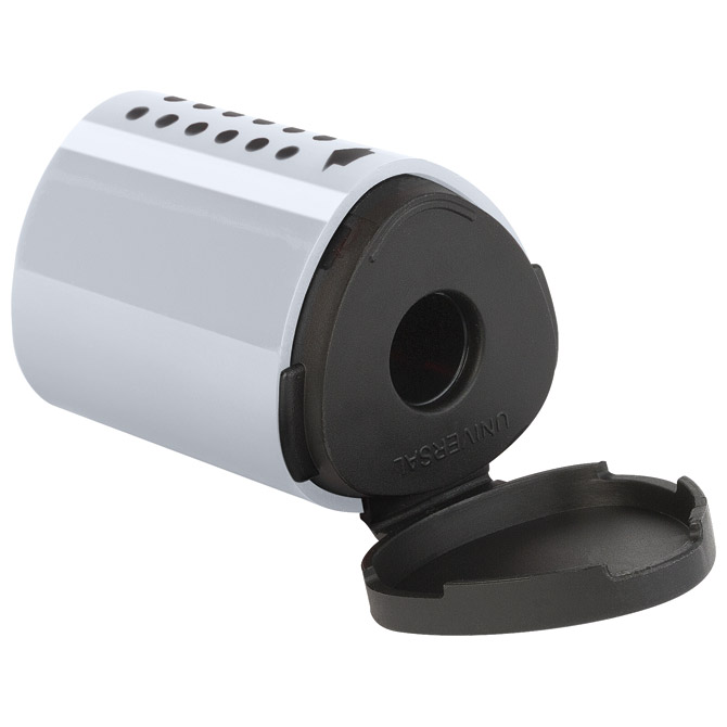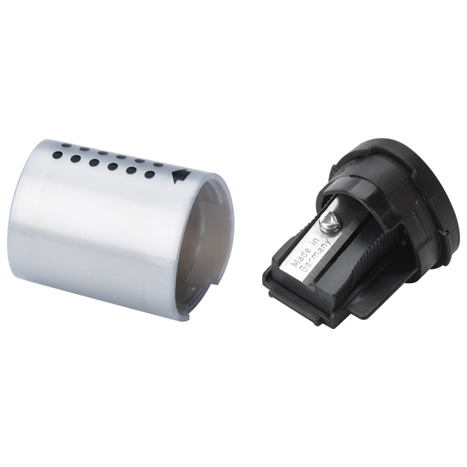 PVC; s PVC kutijom; 1 rupa; dimenzija: 3,5×2,5 cm (visina x fi); izmjenjivi nož; sa sigurnosnim vijkom; ergonomsko; trokutasto tijelo; s patentiranim gripom za sigurno, ne klizno držanje; za trokutaste, šesterokutne i okrugle olovke standardne debljine (grafitne i drvene bojice) sa kutom šiljenja od 24°; poklopac sprečava ispadanje otpada