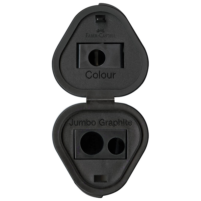 PVC; s PVC kutijom; 3 rupe; visokokvalitetno; ergonomsko; trokutasto tijelo; s patentiranim gripom za sigurno, ne klizno držanje; za trokutaste, šesterokutne i okrugle olovke standardne debljine i Jumbo (grafitne i drvene bojice); poklopac sprečava ispadanje otpada; sa velikim obostranim spremnikom za ostatke