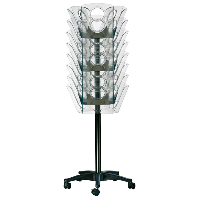 samostojeći; čvrsta metalna konstrukcija; na kotačima s kočnicom za maksimalnu sigurnost; kapacitet: 24 ladice Presenter Leitz 5401 ili 6 kompleta ladica Presenter Leitz 5400 (u tri stupca); ladice nisu uključene u cijenu; visina: 1410 mm bez ladica, 1560 mm sa ladicama; promjer baze: fi 580 mm