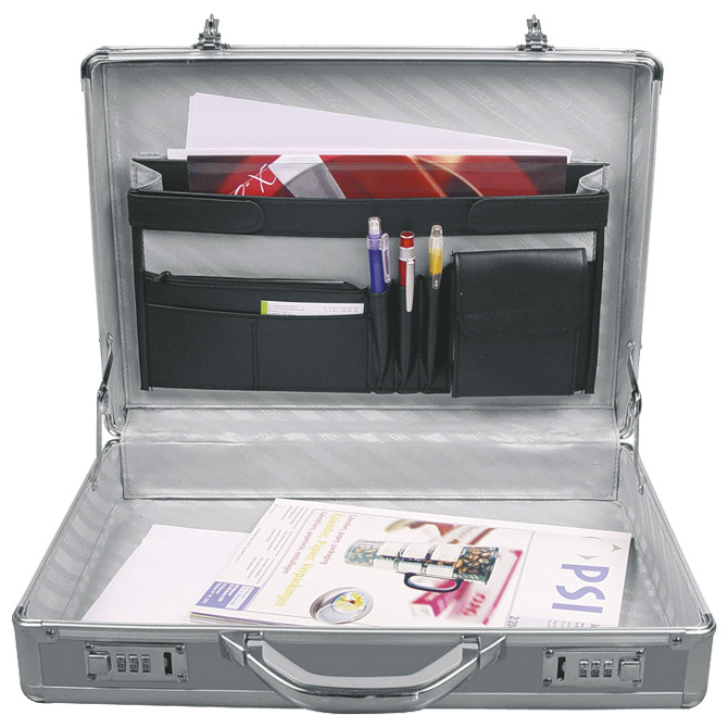 aluminijska; s ručkom i 2 kopče na šifru; na gornjem poklopcu ima: 2 velika pretinca (na bočnim stranama se mogu pričvrstiti sa remenčićima na gumb), 2 mala pretinca, 1 džep na zip, 1 džep na gumb i mjesto za 3 olovke; ima 4 nogice za stabilnost; unutrašnja dimenzija: 32x45x10 cm; vanjska dimenzija: 34,5x46x12 cm; dimenzija prostora za 17″ prijenosno računalo (30x43x7 cm); težina: 2,4 kg