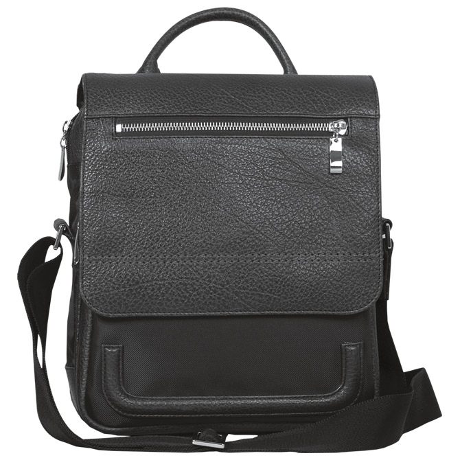 kožna; muška; ima: glavni odjeljak sa zatvaranjem na zip, 1 pregradu sa zatvaranjem na čičak, 1 džep sa zatvaranjem na zip i 2 pretinca; zatvara se sa 2 gumba (magneta) na preklopu (ima džep na zip); ručka za nošenje i remen za nošenje na ramenu (ne može se skinuti); dimenzija: 27x23x8 cm
