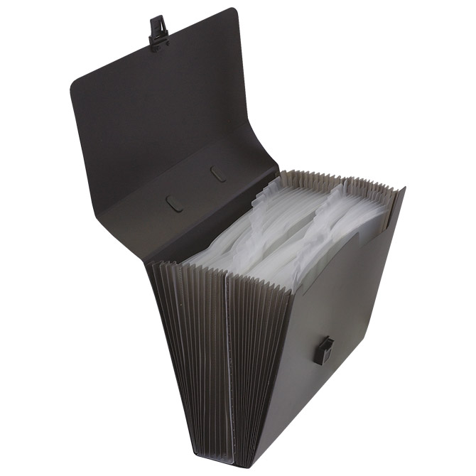 format: A4; dimenzija: 330x240x75 mm; PP; ima 26 prozirnih PP pregrada; s ručkom i kopčom za zatvaranje