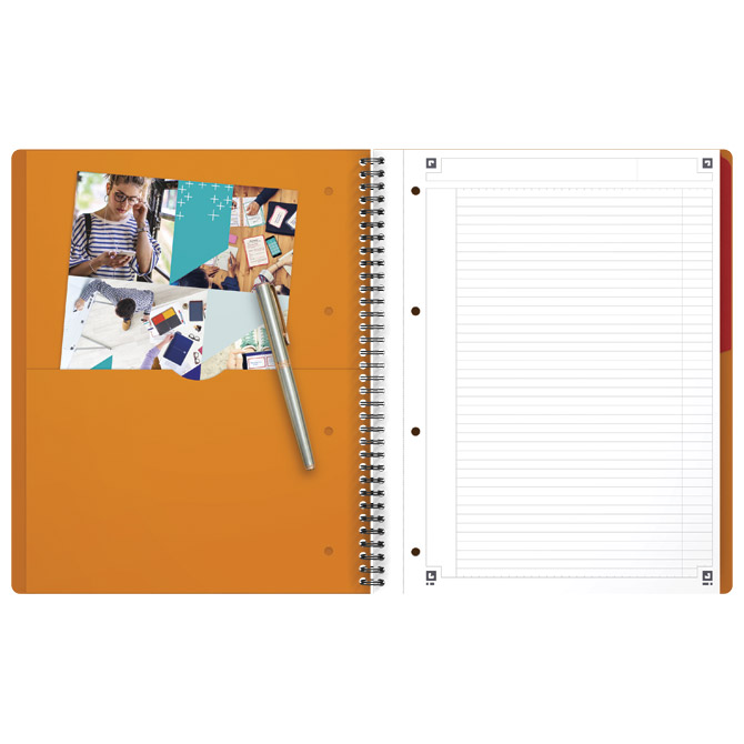 s 4 rupe i perforacijom; PP; 80 listova; sa zaglavljem i dvostrukim marginama; OPTIK PAPER+®, jedinstvena udobnost pisanja, tinta ne prolazi kroz papir; kompatibilan sa scribzee aplikacijom za skeniranje, organiziranje i dijeljenje bilješki; pomicanje PP registra za označavanje prve prazne stranice ili za podjelu bilježnice na 2 dijela; džep za pohranu i prijenos dokumenata; dvostruki spiralni uvez omogućuje 360° okretanje i potpuno pisanje svake stranice; otporna i fleksibilna korica od polipropilena