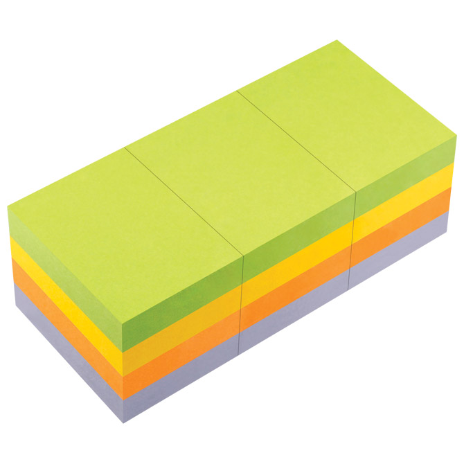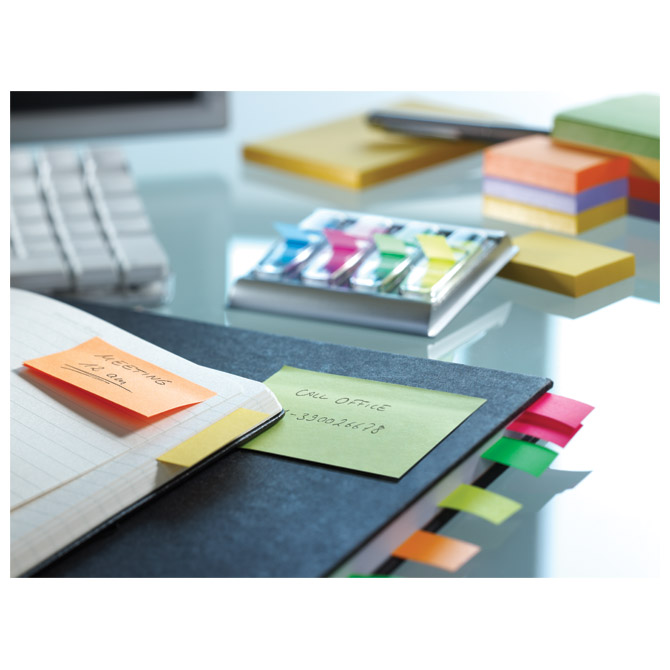 dimenzija: 40×50 mm; 12×100 listova; mogućnost višestrukog premještanja; ljepilo je bez otapala izrađeno na bazi vode; 4 neon boje: ljubičasta, narančasta, zelena i žuta
