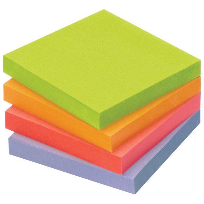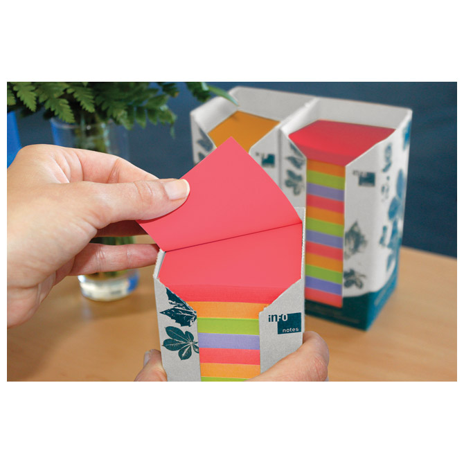 dimenzija: 75×75 mm; 16×100 listova; mogućnost višestrukog premještanja; izrađen od 100 % recikliranog papira; ekološki prihvatljiv (Blue Angel certifikat); ljepilo je bez otapala izrađeno na bazi vode; 4 boje: crvena, ljubičasta, narančasta i kiwi zelena; u 100 % recikliranoj kartonskoj kutiji