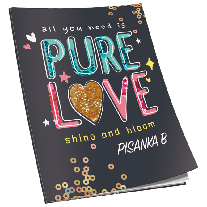format: B5; papir: 80 g/m2; korice soft (gumirane) i parcijalno glitter (kunstdruck 300 g/m2); sa predlistom i zalistom