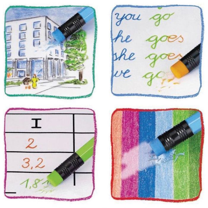 šiljene; debljina mine: 3,3 mm; trokutaste; ergonomske; mogu se brisati s gumicom; s patentiranim gripom za sigurno, ne klizno držanje; živopisne boje; jako mekan vrh za veću pokrivenost površine papira bojanjem; posebno je otporna na lomljenje (specijalno spajana – SV); ispiru se sa većine tkanina; eko olovka (drvo iz certificiranog održivog šumarstva); tijelo lakirano eko lakom na bazi vode; pogodna za ljevake i dešnjake; mjesto za upisivanje imena na svakoj bojici; idealna za: za razdvajanje slogova, za isticanje riječi i za podvlačenje teksta; set od 10 boja; kartonska kutija; blister