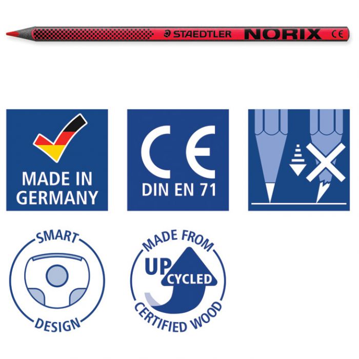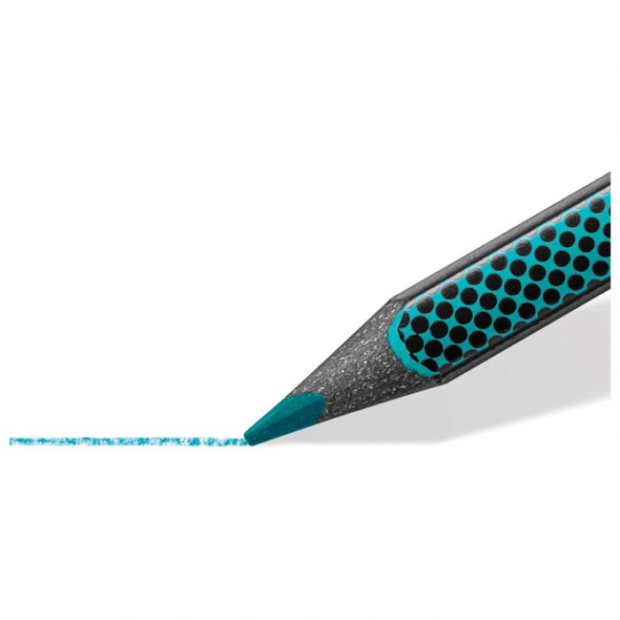 šiljene; novi,jedinstveni oblik olovke povećava udobnost pisanja i crtanja; meka neklizajuća površina olovke; crno drvo; meka mina otporna na lom; živopisne boje; izrađena od prerađenog drvnog otpada (Upcycled wood); izrađene od certificiranog drva; u kartonskoj kutiji (od 80 % recikliranog materijala); blister