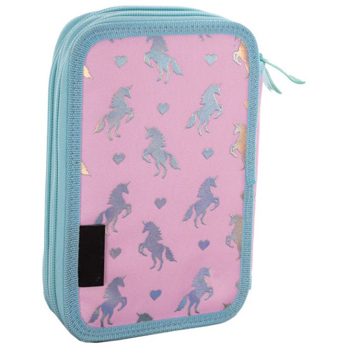 2 zipa; sadrži 32 komada pribora: flomaster školski 12 boja, boje drvene 14 boja, olovka grafitna HB x 3 komada, šiljilo, gumica, ravnalo pvc; holografski print; dimenzija: 20,5x13x4,5 cm
