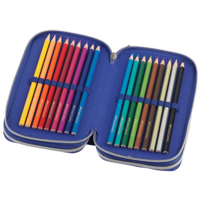 3 zipa; Faber- Castell punjenje s 44 komada pribora: flomaster školski 18 boja, boje drvene 18 boja, 1 olovka grafitna HB, šiljilo, gumica, ravnalo 15 cm, ljepilo 9g, škare, 2 olovke kemjske (plava i crvena); visokokvalitetna podstava i zatvarači