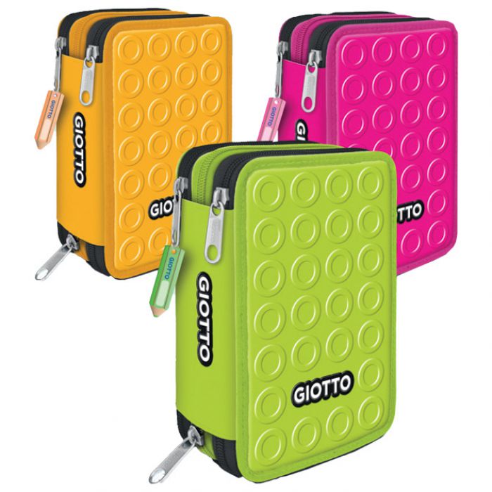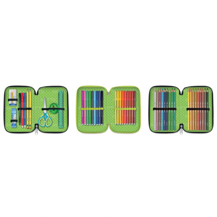 3 zipa; Giotto punjenje s 46 komada pribora: flomaster školski 18 boja, boje drvene 18 boja, 1 olovka grafitna HB, 1 olovka grafitna 2B, šiljilo, gumica, ravnalo 15 cm, ljepilo 10g, škare, 2 olovke kemjske s gumicom za brisanje tinte (plava i crvena); 1 olovka kemijska (crna tinta); dimenzija: 12,9×19,5×7,5 cm