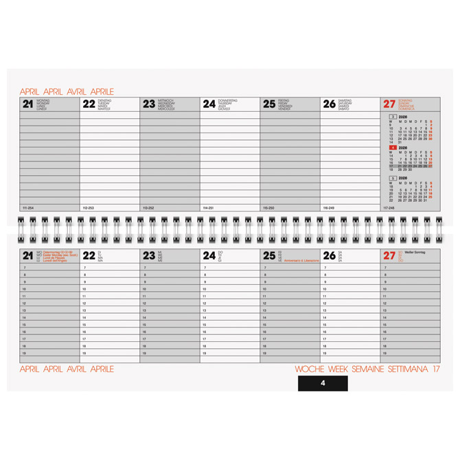 dimenzija: 297x 105 mm; izrađen je od prirodnog kartona od konoplje; svake dvije stranice predstavljaju jedan tjedan; tiskane oznake za mjesece na donjoj uzdužnoj strani; tekst na: engleskom, njemačkom, francuskom i talijanskom; dnevna raspodjela je od 7 do 19 sati s oznakama za sate; sadrži 2 stranice mjesečnog plana za trenutnu godinu i 2 stranice za sljedeću godinu;spiralni uvez; ukupno ima 112 stranica