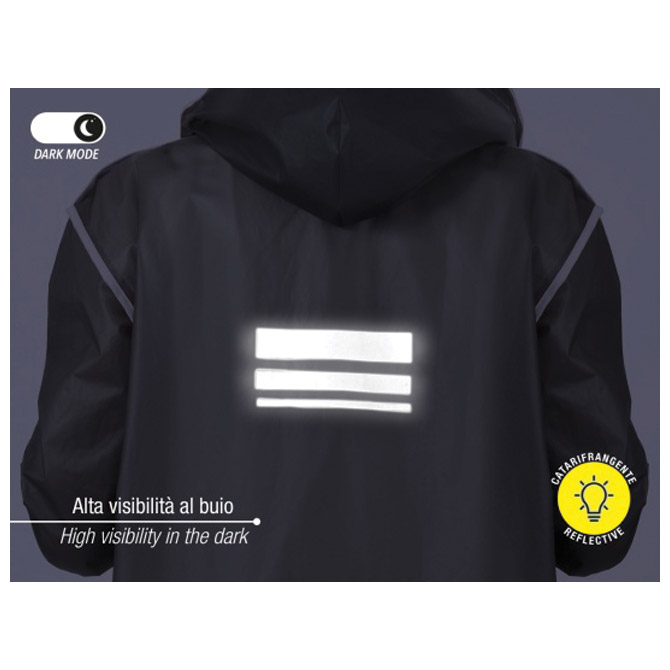 siva, reflektirajući rub, kopčanje – bijeli gumbi, kapuljača, kvalitetan EVA ( Etilenvinil acetat) materijal, pakranje u torbici, lagana, mekana, vodootporna
