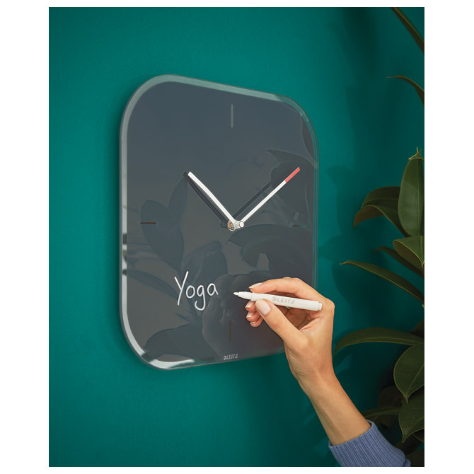 dimenzija: 30x30x4 cm; tihi kvarcni satni mehanizam idealan je za urede, prostore za čitanje i spavaće sobe tako da vas ne ometa zvuk otkucavanja sata; napravljen od kaljenog sigurnosnog stakla od 4 mm s velikom otpornošću na ogrebotine i udubljenja; vrh kazaljke za minute je crvene boje; idealan za dom i ured; može se kombinirati s ostalim Leitzovim proizvodima iz Cozy asortimana za udobnost i stil uz vrhunsku kvalitetu, idealno za produktivno radno okruženje; dolazi sa jednim markerom za pisanje vlastitih brojeva ili bilješki po staklenom satu sa brisačem na čepu; 1 AA baterija (nija uključena); u kartonskoj kutiji