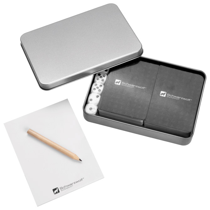 Schwarzwolf putni set igraćih karata i kockica u limenoj kutiji; Ovaj će vam set sigurno dobro doći, na primjer tijekom kampiranja, kada ćete s prijateljima moći uživati ??u večeri uz zabavnu igru ??ili jednostavno kod kuće s obitelji; Set sadrži 2 × 54 igraće karte s vodoodbojnom površinskom obradom, 6 kockica, 15 papirića za bilješke i olovku: Pakirano u poklon kutiji. Dimenzije: limena kutija 10 × 2,5 × 14,5 cm, karte 6,2 × 8,7 cm.