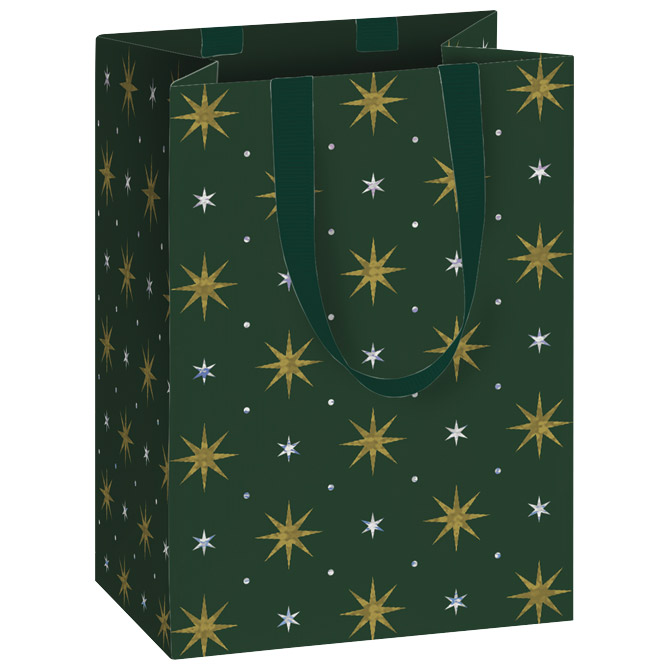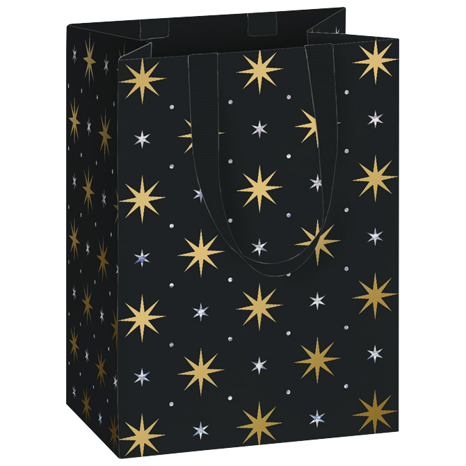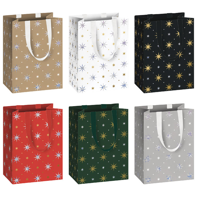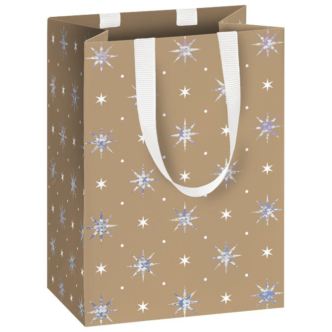 papir bijeli premazni; folija parcijalno; ručke: saten; dimenzija: 10x14x8 cm; motiv: 6 zvjezdice; blister