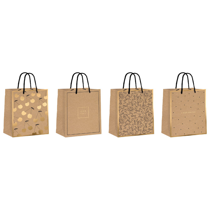 smeđi kraft papir sa zlatnom dekoracijom; 150 g; pletene ručke: špaga; ojačano dno; 4 motiva