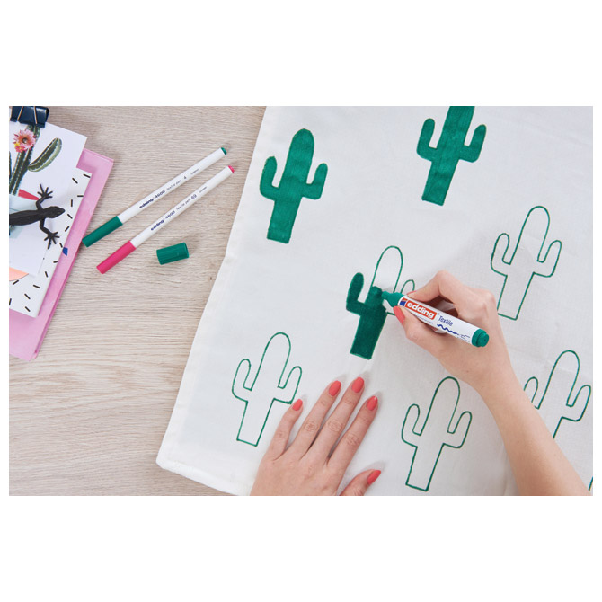 permanentni, pigmentni marker za majice (pamuk, svila, lan…); okrugli vrh; širina ispisa 2-3 mm; vodootporan; otporan na svjetlo; za fiksiranje glačati vrućom peglom bez pare; nakon fiksiranja otporan na pranje do 60° C; brzo se suši