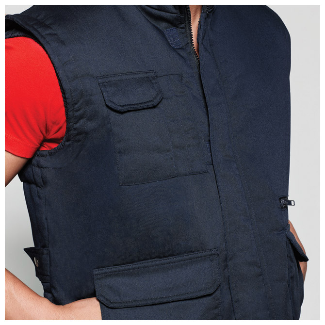 muški; na zip; dodatno zatvaranje na čičak; duža leđa; 3 džepa na preklop, 1 džep na zip te 2 džepića za olovke s vanjske strane i 1 džep sa zatvaranjem na čičak s unutarnje strane; 2 remenčića za podešavanje širine leđa; 200 g/m2; sirovinski sastav: 85 % poliester, 15 % pamuk i unutrašnja strana 100 % poliester
