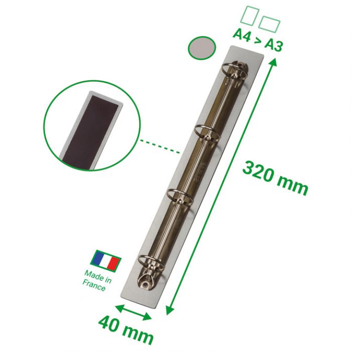 za uložni fascikl; aluminijski (80 % reciklirani); 4 ringa; fi: 30 mm; dimenzija: 320×40 mm; za dokumente: A5, A4 i A3; ima PVC magnet koji se može premještati po želji; vodoravno do 1kg papira, okomito do 0,5 kg papira