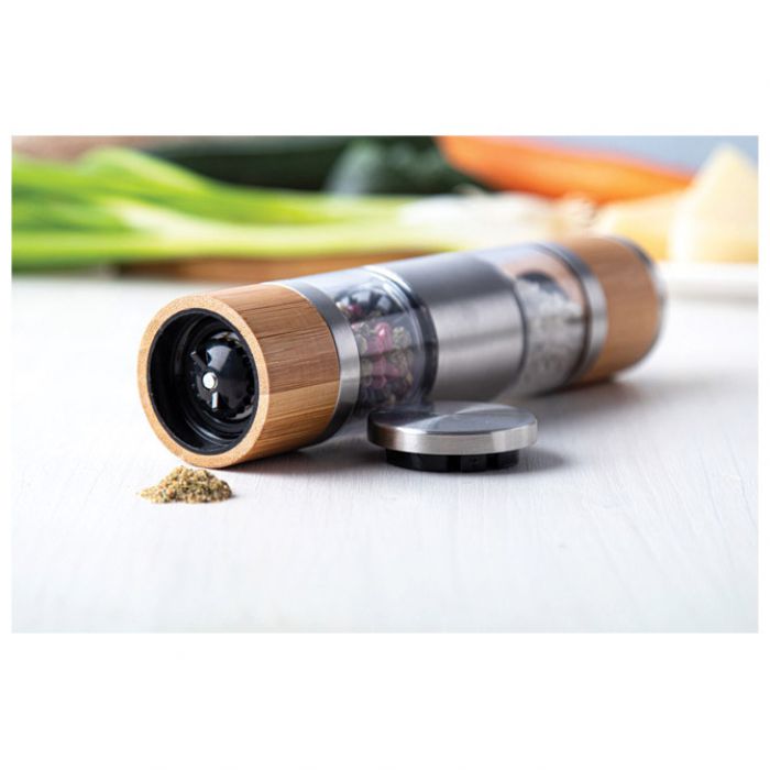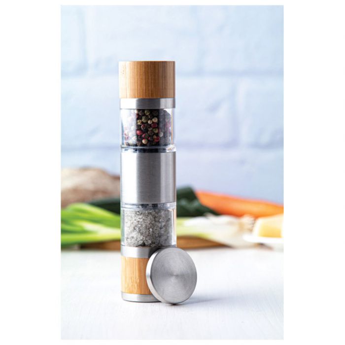 Dvostrani ručni mlin za sol i papar u kućištu od nehrđajućeg čelika i bambusa, s keramičkom jezgrom mlina.