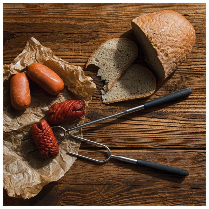 set od dvije teleskopske vilice za roštilj, pakirane u najlonsku torbicu s uzicom; materijal: nehrđajući čelik, PVC ručka; preporučena tehnologija tiska: lasersko graviranje L1, sitotisak S2 na vrećici; maksimalna veličina otiska: 25×5 mm/100×40 mm dimenzije: složeno 24,5 cm, rasklopljeno 86 cm; ugljični otisak: gCO2 e1214
