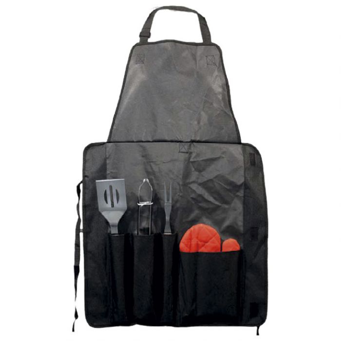 sadrži: 3 dijela i rukavice; u torbici koja može služiti kao pregača; sirovinski sastav: 100 % poliester