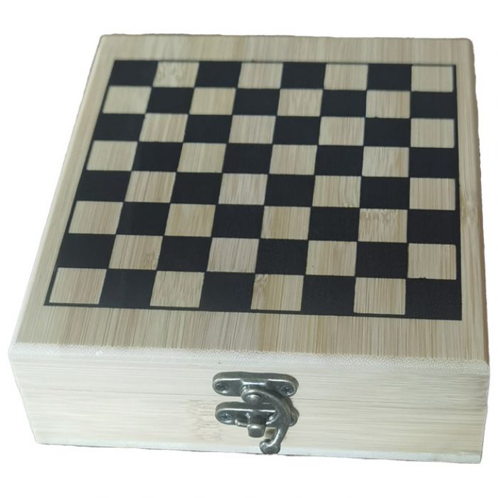sadrži: figure za šah i 3-dijela pribora; na poklopcu iscrtano šahovsko polje; dimenzija kutije: 17×14,7×4,5 cm; kutija bambus; u poklon kutiji